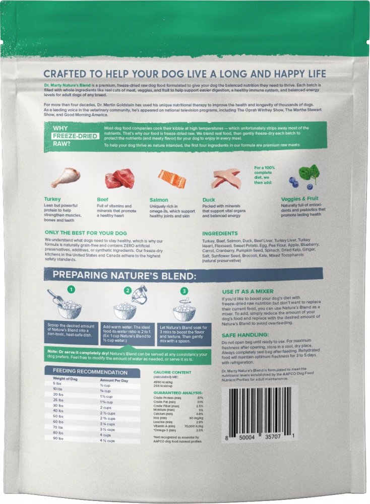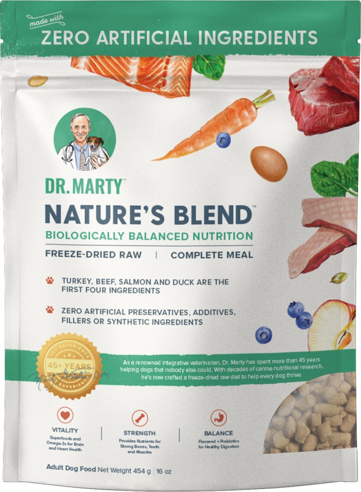 Nature’s Blend, Dr. Marty Premium Freeze-Dried Dog Food, is a nutrition-packed formula designed to give your dog a healthier, happier life. We blend a variety of meats, fish, ranch-raised beef and duck, and other protein sources with fruits and vegetables for the balanced, complete nutrition your dog needs. We receive all our ingredients fresh, then gently freeze dry them so they’re bursting with flavor and nutrition.
