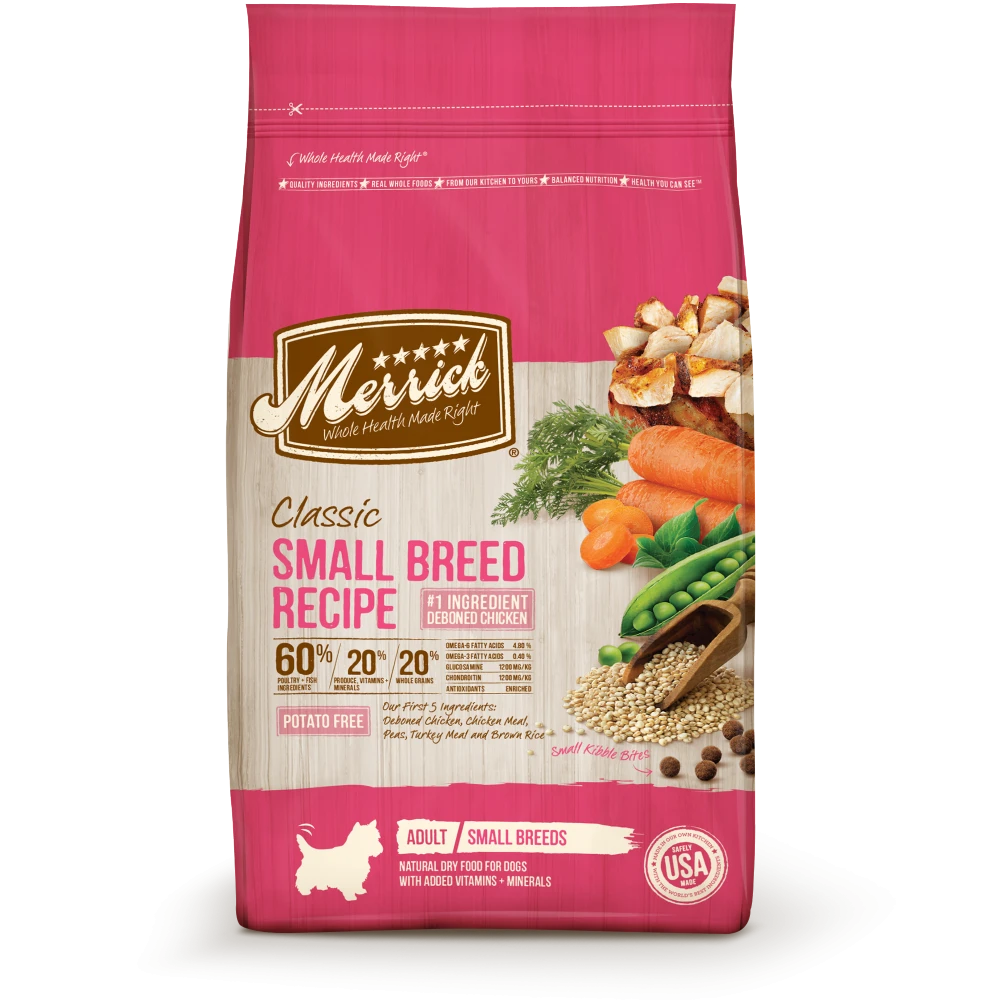 Merrick Classic Small Breed Recipe Dry Dog Food provides natural nutrition from a wholesome balance of protein, whole grains, fruits, and vegetables all in a smaller kibble size perfect for the pint sized pals in your life! Merrick Classic Small Breed Recipe Dry Dog Food starts with real, farm fresh deboned chicken for high quality protein. Fresh produce and a healthy blend of whole grains including oatmeal and ancient grains like quinoa, while high levels of Omega 6 and Omega 3 fatty acids aid in a healthy skin and coat, accompanied with glucosamine and chondroitin to support healthy joints and hips