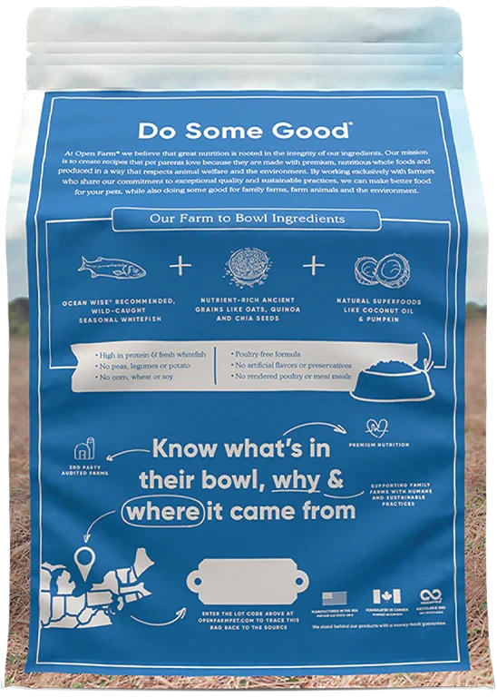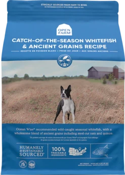 Open Farm Catch-of-the-Season Whitefish & Ancient Grains recipe is formulated to meet the nutritional levels estimated by the AAFCO Dog Food Nutrient Profiles for all life stages except for the growth of large-size dogs (70 lbs or more as an adult).