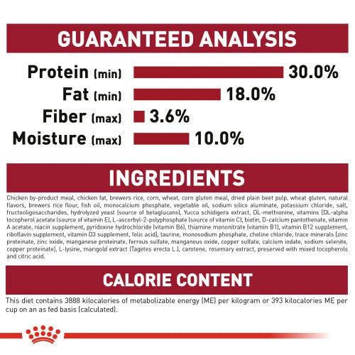 Chicken by-product meal, chicken fat, brewers rice, corn, wheat, corn gluten meal, dried plain beet pulp, wheat gluten, natural flavors, brewers rice flour, fish oil, monocalcium phosphate, vegetable oil, sodium silico aluminate, potassium chloride, salt, fructooligosaccharides, hydrolyzed yeast (source of betaglucans), Yucca schidigera extract, DL-methionine, vitamins [DL-alpha tocopherol acetate (source of vitamin E), L-ascorbyl-2-polyphosphate (source of vitamin C), biotin, D-calcium pantothenate, vitamin A acetate, niacin supplement, pyridoxine hydrochloride (vitamin B6), thiamine mononitrate (vitamin B1), vitamin B12 supplement, riboflavin supplement, vitamin D3 supplement, folic acid], taurine, monosodium phosphate, choline chloride, trace minerals [zinc proteinate, zinc oxide, manganese proteinate, ferrous sulfate, manganous oxide, copper sulfate, calcium iodate, sodium selenite, copper proteinate], L-lysine, marigold extract (Tagetes erecta L.), carotene, rosemary extract, preserved with mixed tocopherols and citric acid.