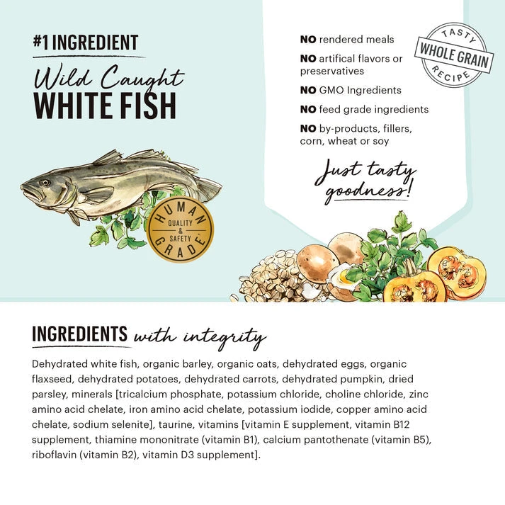 Dehydrated white fish, organic barley, organic oats, dehydrated eggs, organic flaxseed, dehydrated potatoes, dehydrated carrots, dehydrated pumpkin, dried parsley, minerals [tricalcium phosphate, potassium chloride, choline chloride, zinc amino acid chelate, iron amino acid chelate, potassium iodide, copper amino acid chelate, sodium selenite], taurine, vitamins [vitamin E supplement, vitamin B12 supplement, thiamine mononitrate (vitamin B1), calcium pantothenate (vitamin B5), riboflavin (vitamin B2), vitamin D3 supplement].